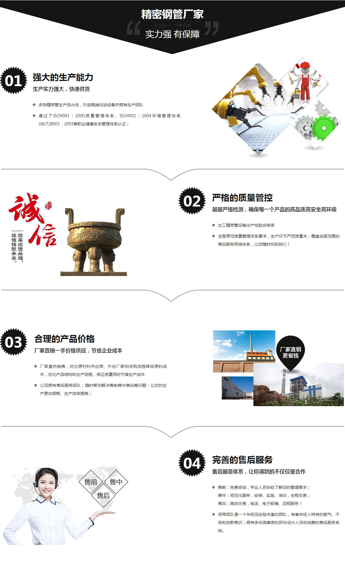 聊城德福管有限公司公司有大量精密鋼管、毛細鋼管、高精度冷拔鋼管、精密異型鋼管現貨,將以優惠的價格,批零兼營的方式,為您提供快捷優質的服務,歡迎新老客戶前來洽談、電議。精密管切削余量少 為達到圖紙所要求的精度,采用精密加工是所有加工方法中去除余量最少的一種加工方法。在珩磨加工中,珩磨工具是以工件作為導向來切除工件多余的余量而達到工件所需的精度。珩磨時,珩磨工具先珩工件中需去余量最大的地方,然后逐漸珩至需去除余量最少的地方。